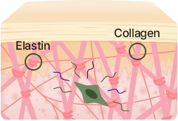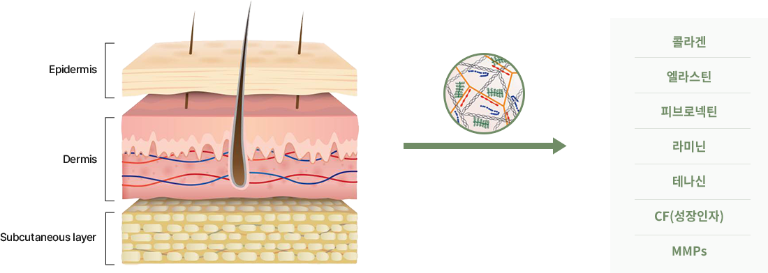 피부 진피층의 구조를 구성하는 핵심 성분인 콜라겐, 엘라스틴, 피브로넥틴을 함유하고 있습니다.